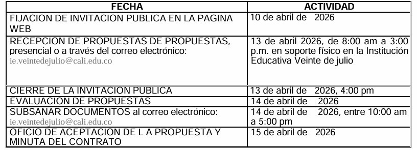 La INSTITUCIÓN EDUCATIVA TECNICO INDUSTRIAL VEINTE DE JULIO Invita a todas las personas naturales o jurídicas para que presenten propuesta y aporten los requisitos exigidos en el estudio previo y la presente invitación, con el propósito de proceder a la selección del contratista para la ejecución del objeto del contrato, procedimiento que se llevará a cabo mediante la selección de CONTRATACIÓN INFERIOR A LOS 20 SMLMV, conforme a lo establecido en el Manual de Contratación de la IE, Decreto 4791 de 2008, Decreto 1082 de 2015, Ley 715 de 2001, Decreto 1075 de 2015, y teniendo en cuenta los principios que rigen la contratación pública (Ley 80 de 1993)
